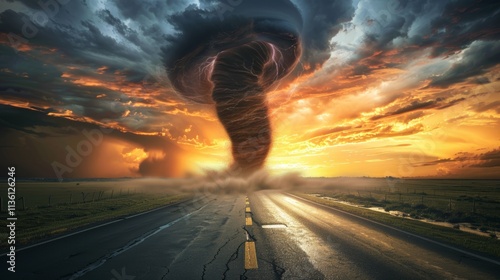 Dramatic tornado landscape at sunset ominous clouds and vivid colors capturing thunderstorm power