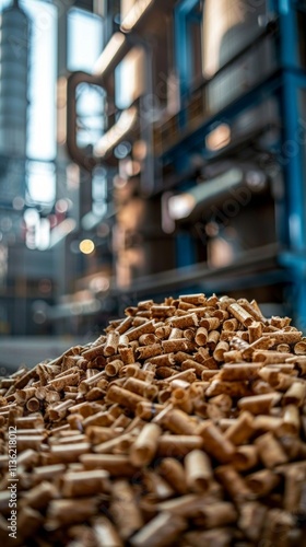 A prominent pile of wood pellets in focus at an industrial factory, with blurred background hinting at expansive machinery and containers. Static industrial atmosphere captured.