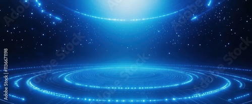 A glowing blue circular design radiates light against a dark starry background, creating a futuristic and ethereal atmosphere.