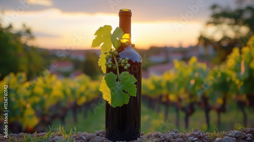 Wine bottle with grapevine leaves on vineyard wall during sunset, ideal for wine tasting events, vineyard tours, rustic decor, countryside lifestyle, harvest season, warm golden light backdrop