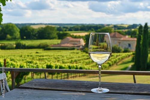 Glass of white wine sits on a wooden table overlooking a picturesque french vineyard, celebrating the art of winemaking