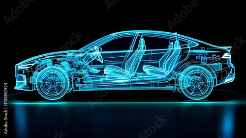 Blue hologram ordinary car, car structure, side view, black background