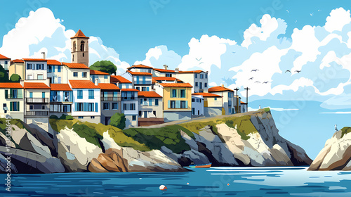 Various houses on hill by sea. basque architecture in ciboure, france. Haven. Illustration