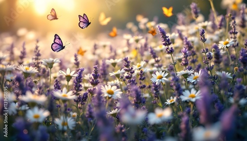 Opis: Colorful butterflies fluttering over a vibrant field of daisies and lavender, with warm sunlight illuminating the scene under a clear blue sky, creating a peaceful spring atmosphere.