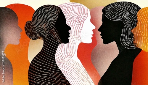 Sylwetki kobiet o różnym kolorze skóry. Risografia, grafika