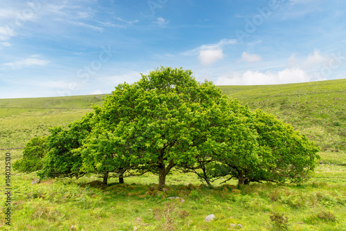 Group of large green trees in hilly landscape in Dartmoor National Park, Devon, UK near Wistman's Wood, an ancient temperate rainforests and high-altitude oakwood against a white clouded blue sky