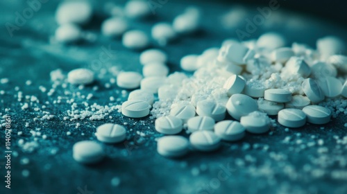 a pile of white pills and powder on a table