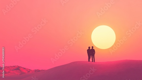 Romantic couple watching sunset on desert dune, peaceful and intimate scene. Valentine's Day