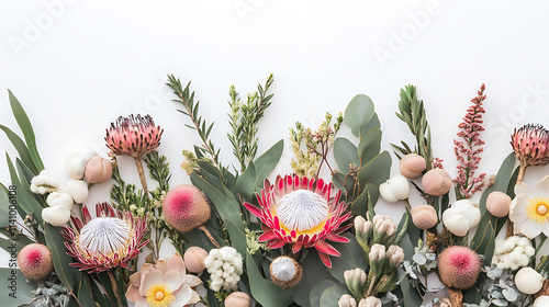 image features a flat lay floral arrangement of mostly australian natives, including proteas, banksias, kangaroo paw eucalyptus leaves and gum nuts on a white background