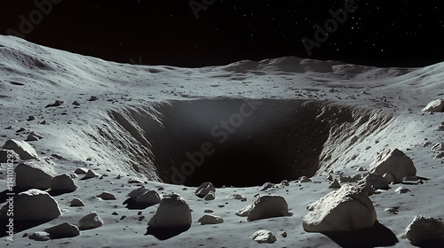 Huge cave, crater on the moon's surface, with rocks scattered around it and a dark hole at its center