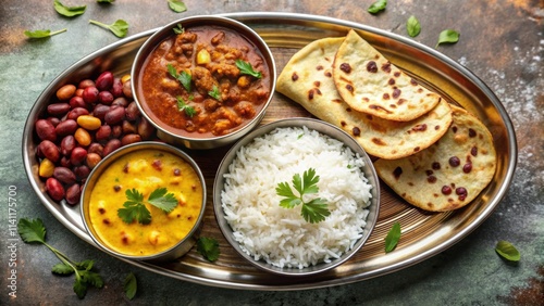 Traditional North Indian meal featuring kidney bean curry, basmati rice, rice roti, and dal curry, North Indian, Food