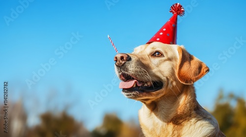 With a red pary hat, a blowout, and a copy space to the side, this adorable dog is rejoicing on a blue backdrop.