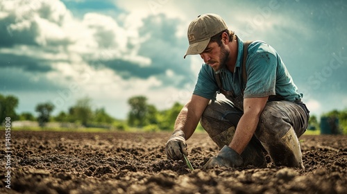 A Determined Farmer Planting Seeds in Fertile Soil Despite Harsh Weather Conditions with Dark Clouds Rolling In