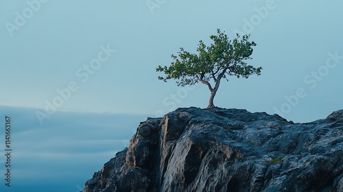 Solitary Tree on Coastal Cliff at Dawn. AI Generated