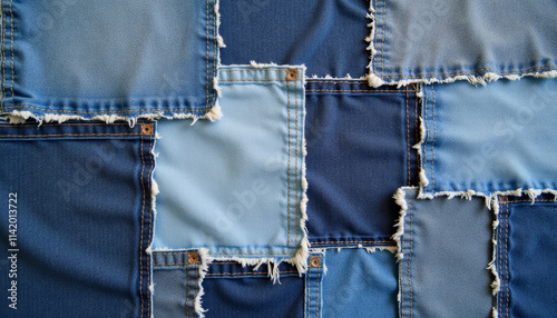 Denim patch texture featuring frayed edges and varying shades of blue on a textured fabric background