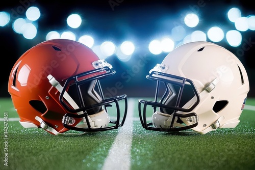 Two football helmets, one orange and one white, face off on a well-lit football field, symbolizing the energetic and traditional aspects of this dynamic sport.