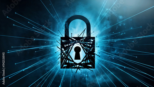 線と三角形で構成されたロックシンボルが青い背景に描かれるデジタルセキュリティの抽象的なデザイン.生成AI