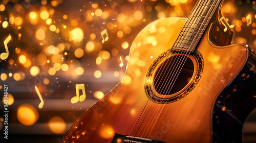 Gitara z delikatnymi nutami unoszącymi się w powietrzu, otoczona subtelnymi światłami bokeh, oddaje atmosferę muzycznej inspiracji.