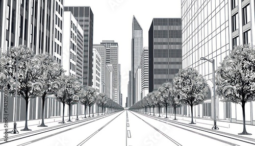 Urban street scene depicted in line art style. Modern buildings line wide avenue. Trees are aligned along road. Perspective creates sense of depth. Illustration showcases urban planning and design.