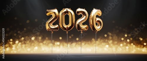 Golden foil balloons spelling out 2026 stand elegantly on blurred holiday background of shimmering lights, capturing the excitement of New Year's celebration and party