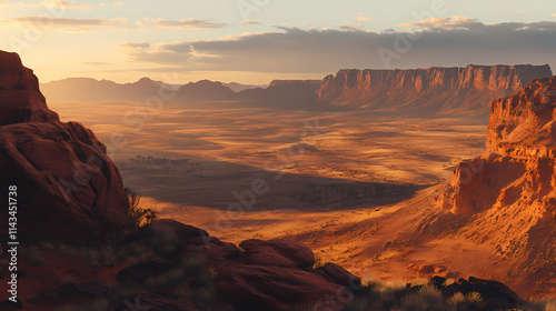 Ethereal mystique of australian outback at dusk, warm golden light casting long shadows on ancient rust-red rock formations, vast desert landscape stretching into infinity. Mystique. Illustration