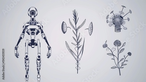 Black and white detailed illustration of a humanoid robot accompanied by abstract botanical elements, merging technology with natural forms. AI generated.