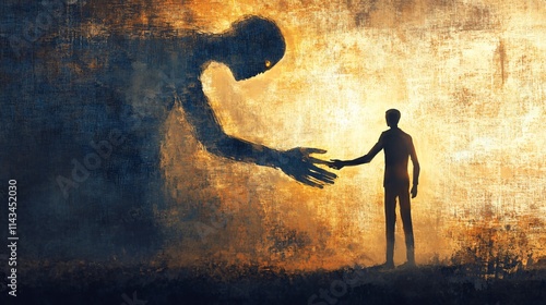 Conceptual image of a person shaking hands with devil in dark tunnel.