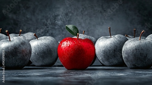 A single vibrant red apple shines among a pile of gray lifeless apples symbolizing the idea of individuality difference and standing out from the crowd This creative
