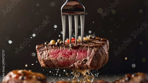 steak A piece of juicy and still smoky steak taken using a fork, macro camera shooting