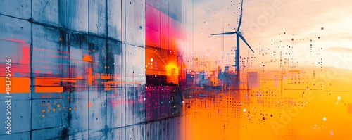 Wind turbines adorned with futuristic digital overlays, representing the rapid advancements in technology and renewable energy solutions