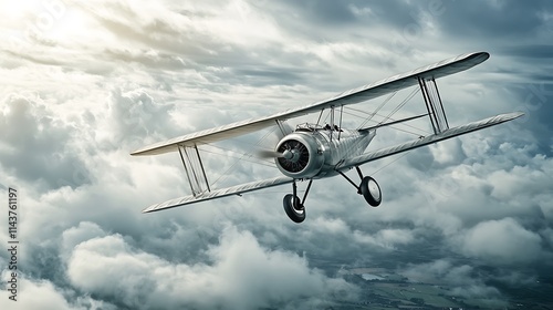 Vintage Biplane Soaring Through Clouds. Concept of Aviation History and Adventure.