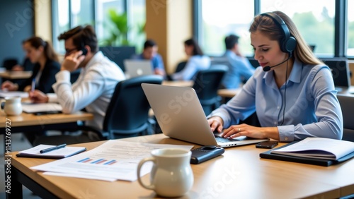 A dedicated customer service rep, her blonde locks shining, focuses intently on resolving an issue amidst a modern call center backdrop, headset securely in place