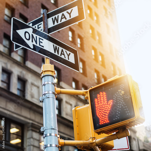 New York City road sign One Way with traffic pedestrian light on the street under sunset light. Urban city lifestyle photo.