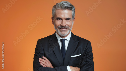 Mature man with a beard and mustache, dressed in a dark suit, white shirt, and tie, standing confidently with a pleasant expression and arms crossed, set against a vibrant orange background.