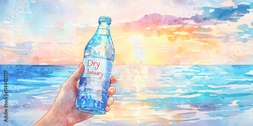 Dry January watercolor illustration with a hand holding a water bottle against a serene ocean sunset, promoting hydration and alcohol-free living.