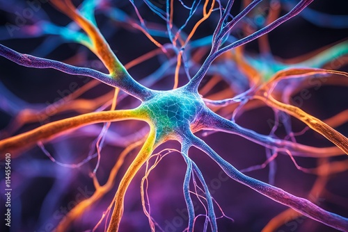 Close-up of a neuron and synapse with glowing neural connections and electrical impulses. Detailed structure with vibrant colors highlighting brain communication.