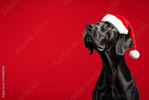 Side portrait of a black Great Dane in a Santa hat looking up on a red background with copy space