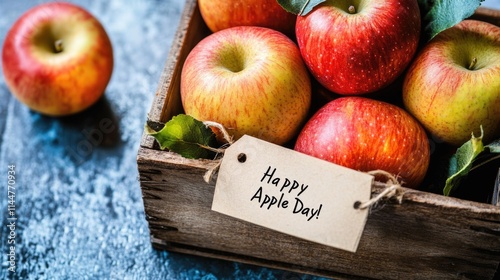 Fresh red apples in wooden crate with happy apple day tag Apple Gifting Day
