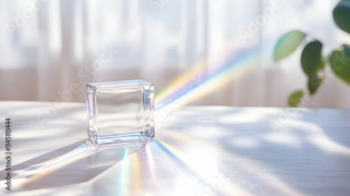 Glass Block Creates Rainbow Light on Table with Sunlight through Window.