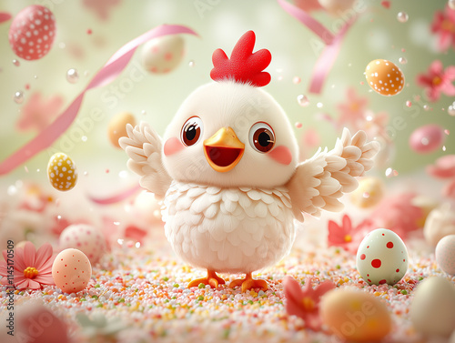 Ilustrowany kurczaczek wielkanocny z pisankami , kolorowe jajka