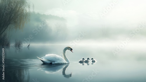 Swan mother and cygnets on a lake