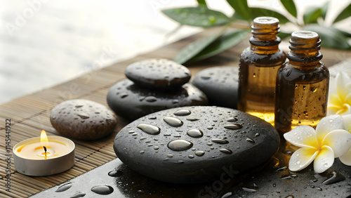 Close up of a therapeutic hot stone set with natural oils copy space below. concept as Detailed close up of a therapeutic hot stone set paired with natural oils symbolizing deep relaxation and wellnes