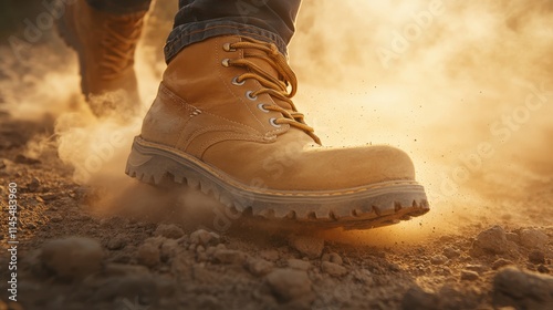 Tan work boots kicking up dust on dirt road. Ideal for adventure, travel, or construction themes.
