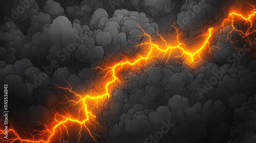 A dramatic view of orange lightning striking through dark, stormy clouds, showcasing the power and intensity of nature's phenomena.