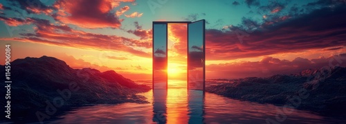 An enchanting ocean scene presents a reflective door at sunset, symbolizing opportunity and introspection, beautifully merging elements of nature and artistic surrealism.