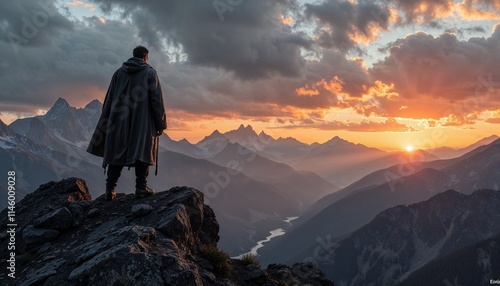 Climber on a rocky ledge watching the sunrise over a vast range of rugged mountain peaks