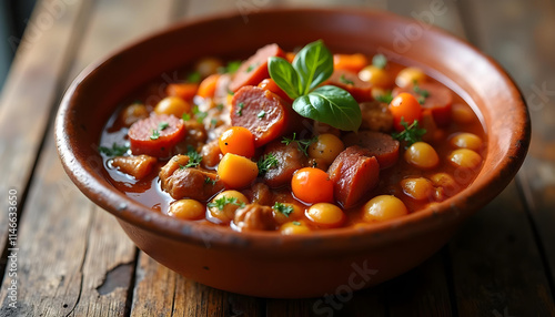 Potaje de garbanzos y carne con verduras. Cazuela de legumbres. Receta española
