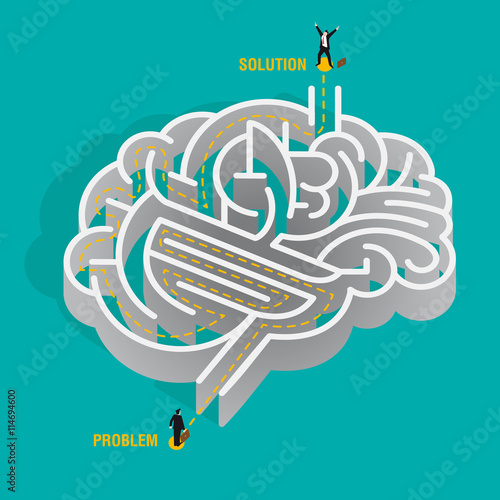 Problem solving. Nice idea of a human brain depicted as a maze. a businessman must overcome the problems by reasoning and thinking without getting lost.