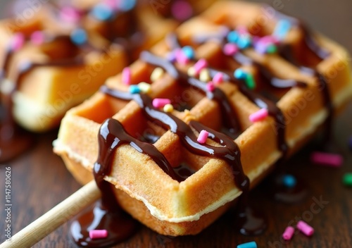 Delightful waffles on a stick with chocolate and colorful sprinkles prepared for a treat