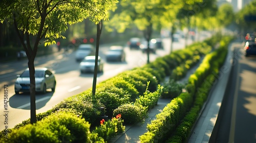 A green street median with neatly planted trees and shrubs, offering a tranquil touch to the busy urban landscape as cars pass by